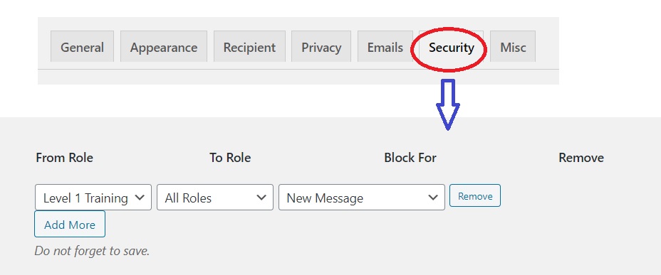Eg. You do not want your “Subscriber” role users can send message to other “Subscriber” role users. Go to Dashboard > Front End PM PRO > Settings > Security > Role to Role Block. Click “Add More” and select “From Role” to “Subscriber”, “To Role” to “Subscriber” and “Block for” to “New Messaage”. Then save changes. Now no subscriber role users will be able to message to another subscriber role users.