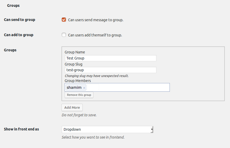 Please go to Dashboard > Front End PM PRO > Settings > Recipient > Groups to create groups and maintain group members. Also you can set how groups will be shown to users, as dropdown or radio button.