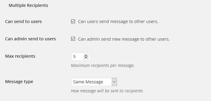 Go to dashboard > Front End PM > Settings > Recipients. under Multiple Recipients section you can set maximum recipients number. Also you can set how message will be sent to recipients.